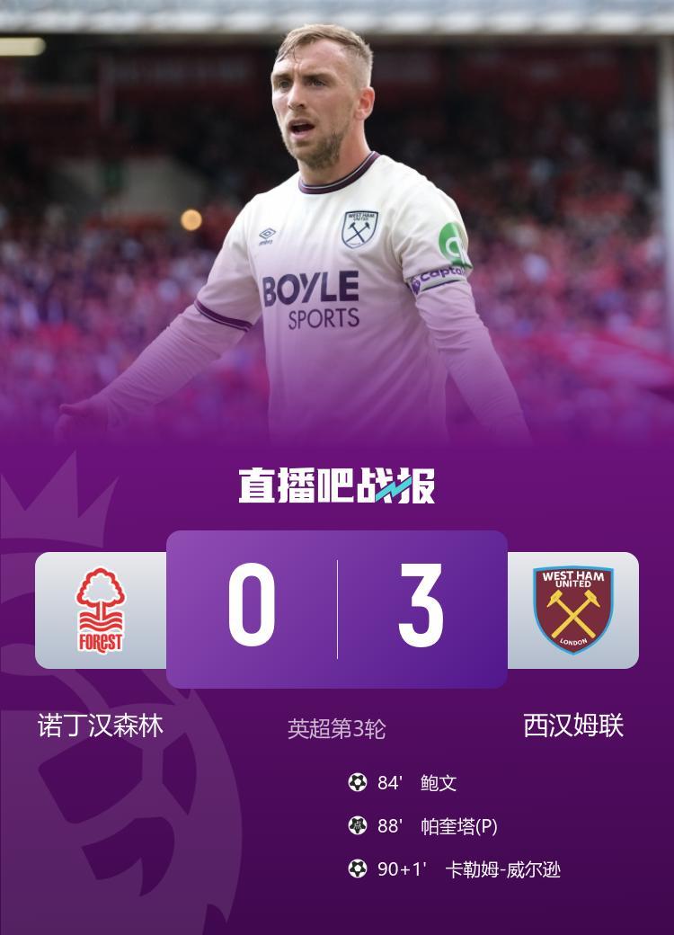 联赛首胜!西汉姆联3-0诺丁汉森林 帕奎塔点射建功鲍文抽射破门